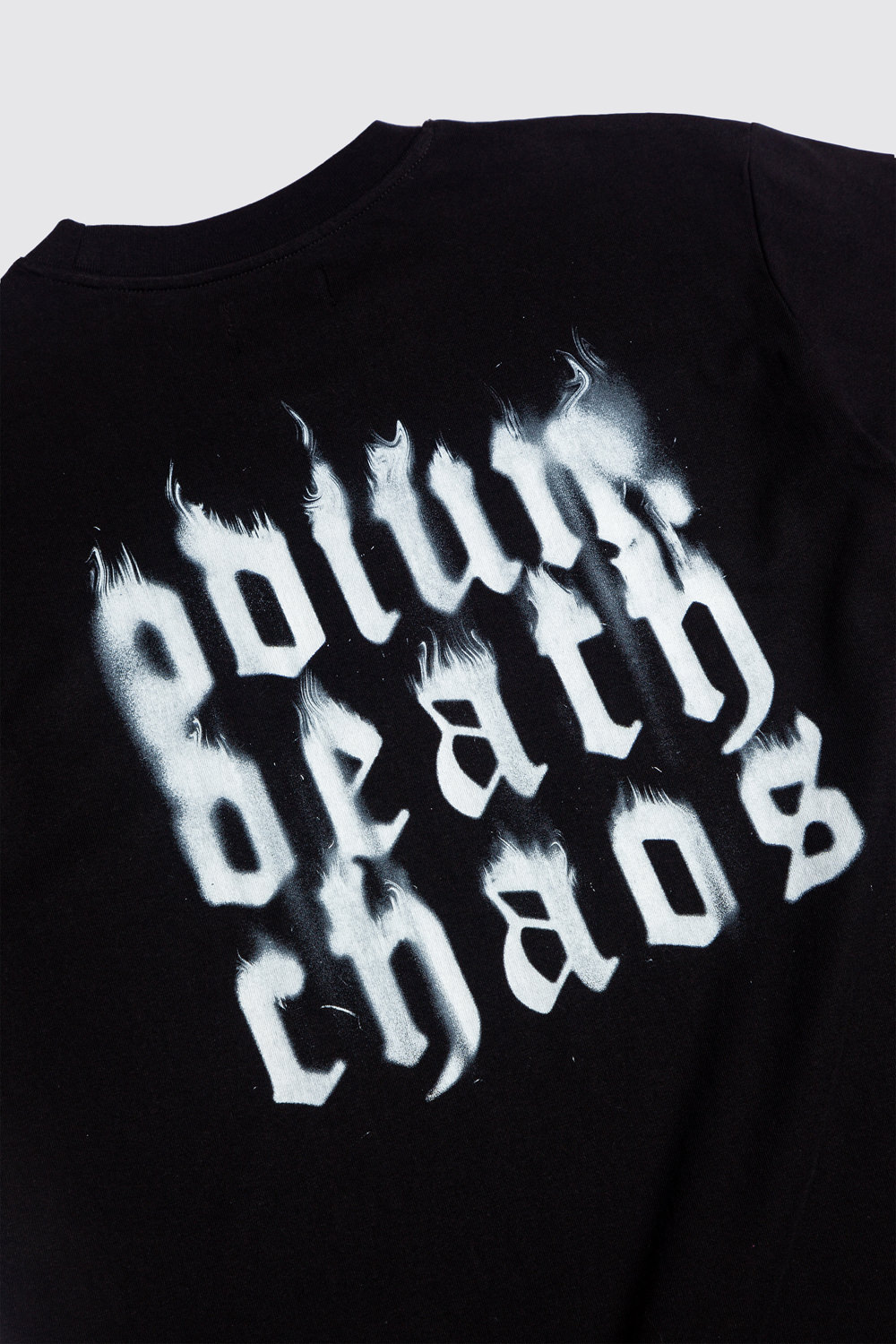Black crew-neck t-shirt with short sleeves, “O.D.C.” logo printed on the front and “Odium – Death – Chaos” print on the back. Loose fit.