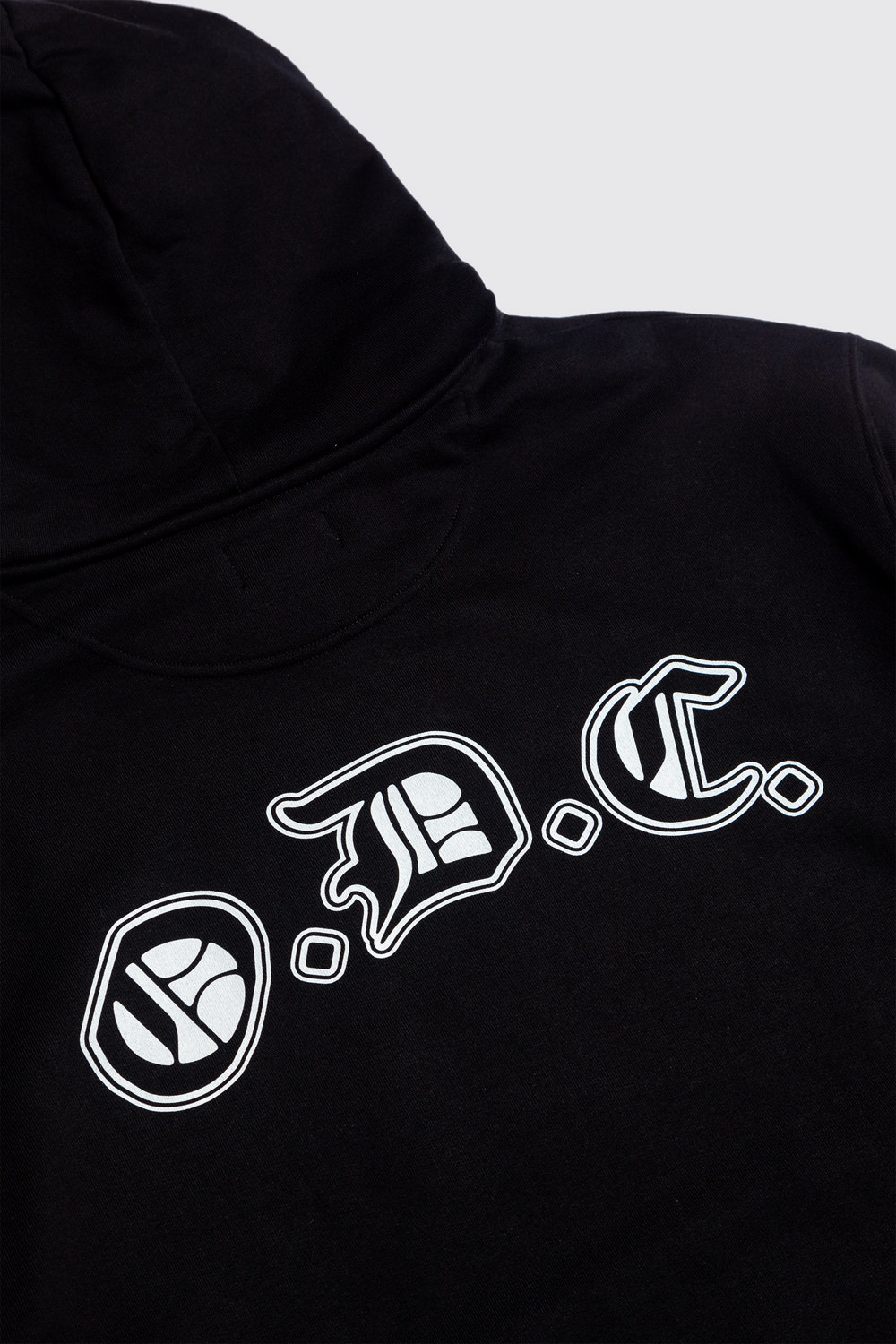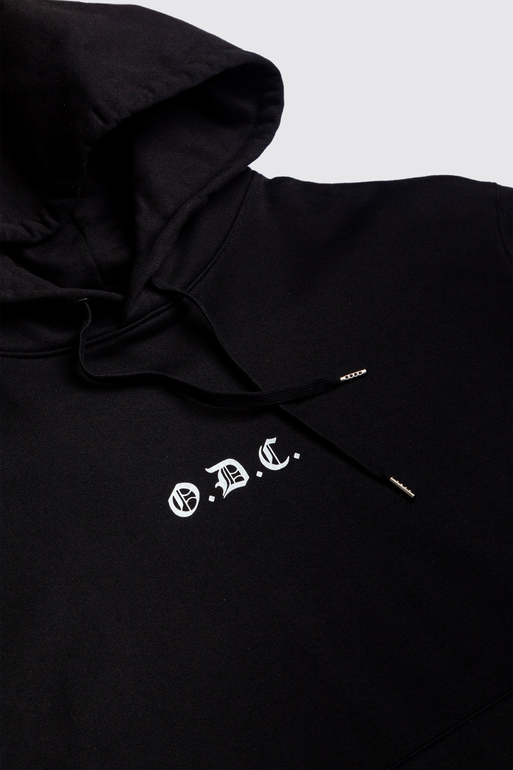 O.D.C. black heavyweight sweatshirt, “O.D.C.” logo on the front and “O.D.C.” print on the back.