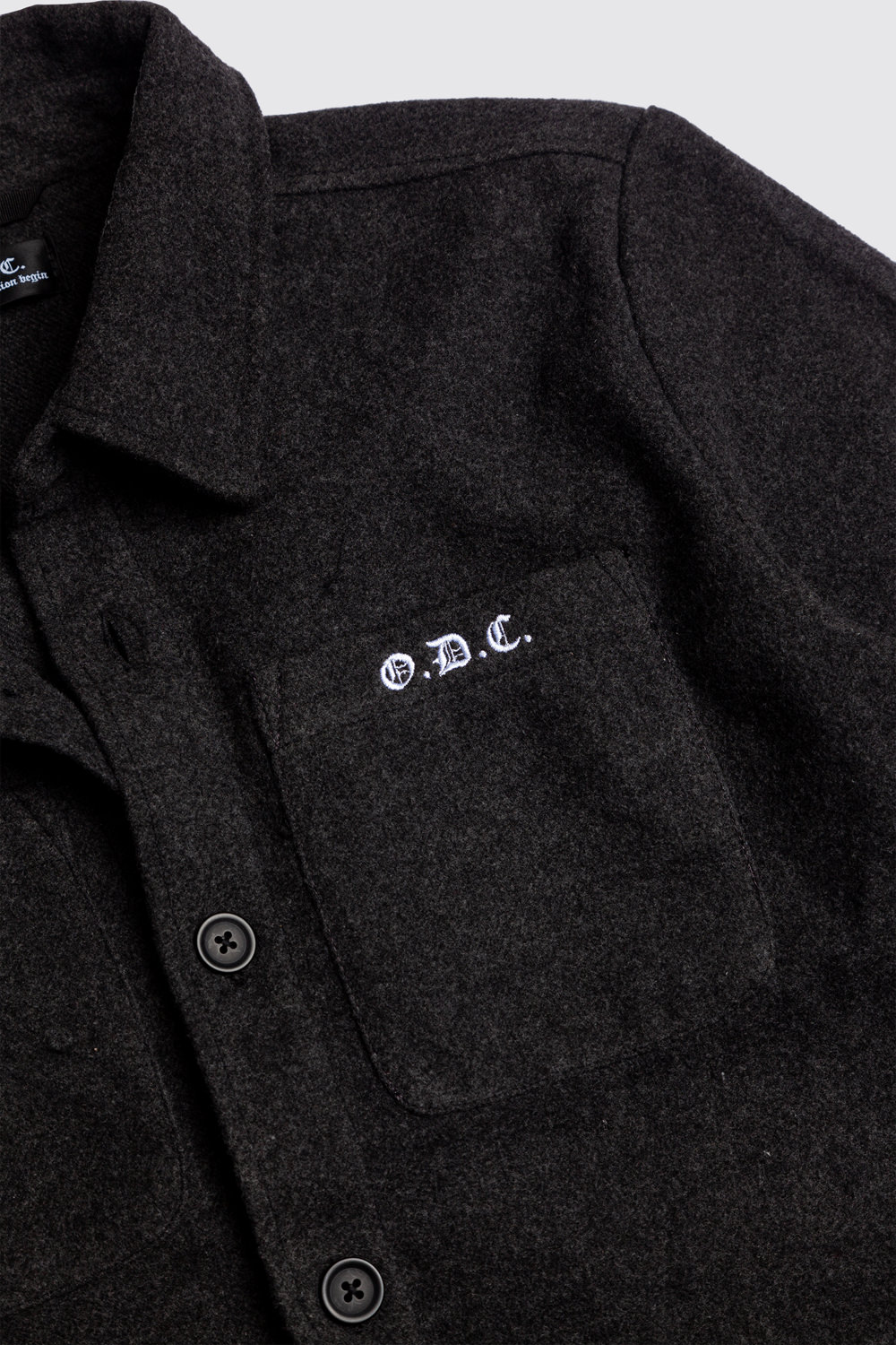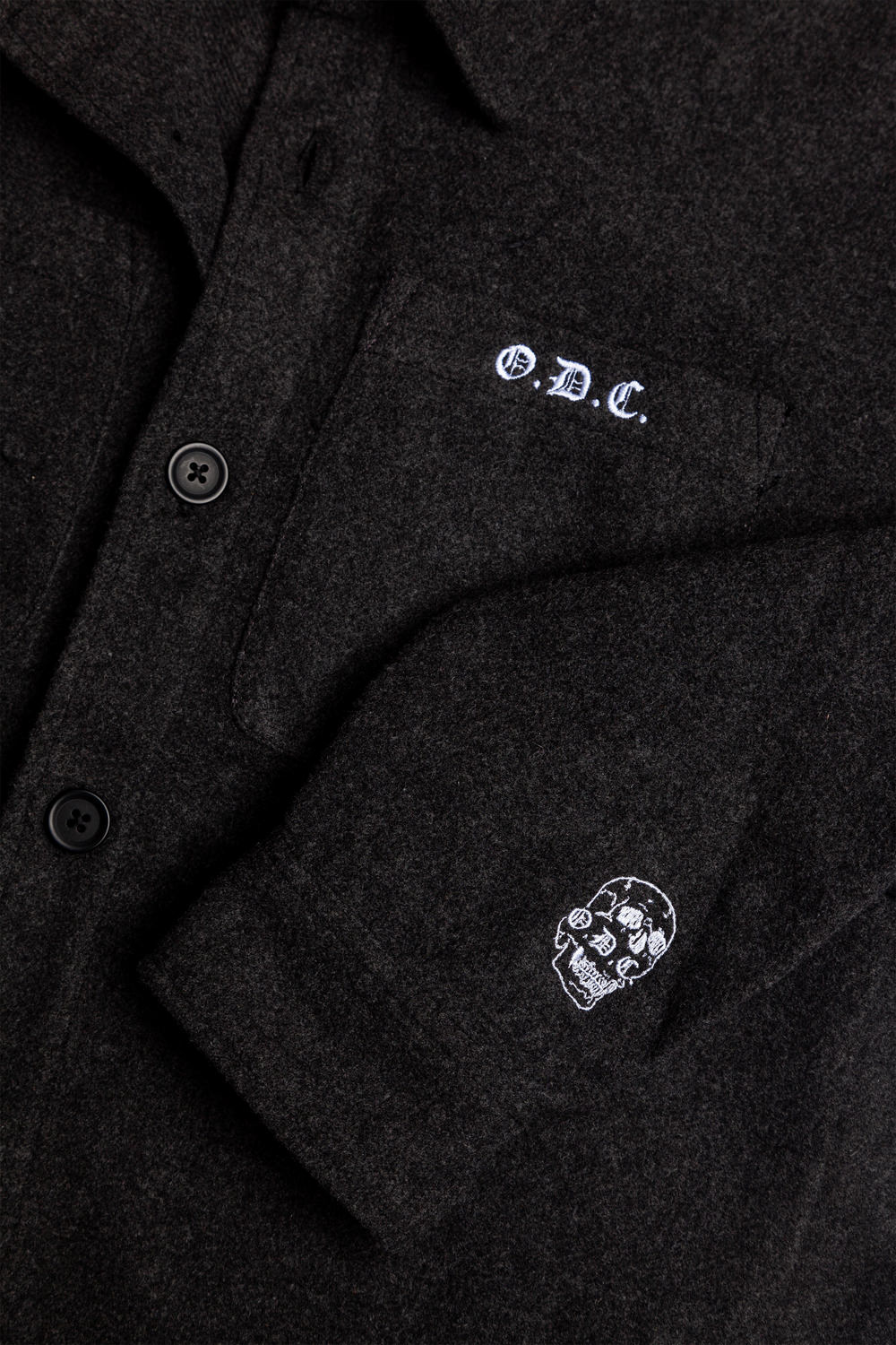 Gray shirt jacket, with embroidered logo on the breast pocket and “O.D.C. skull” logo on the cuff.