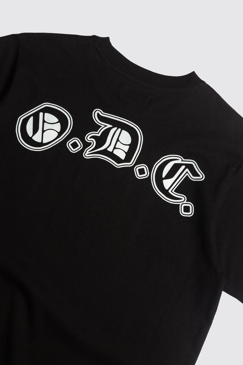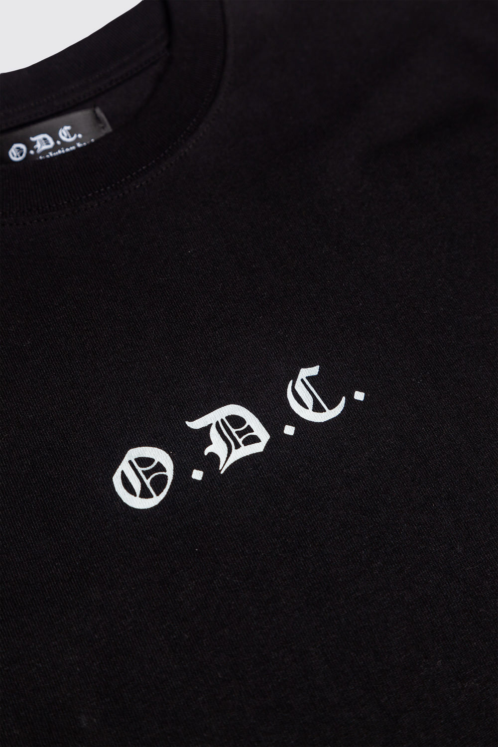 Black crew-neck t-shirt with short sleeves, “O.D.C.” logo printed on the front and “O.D.C.” print on the back. Loose fit.